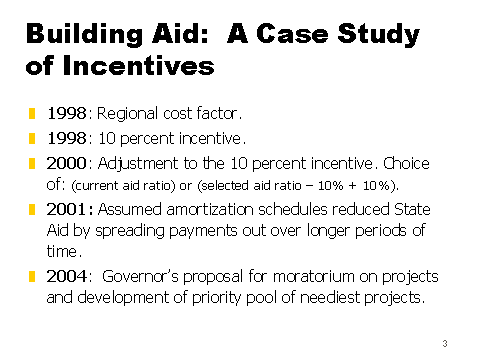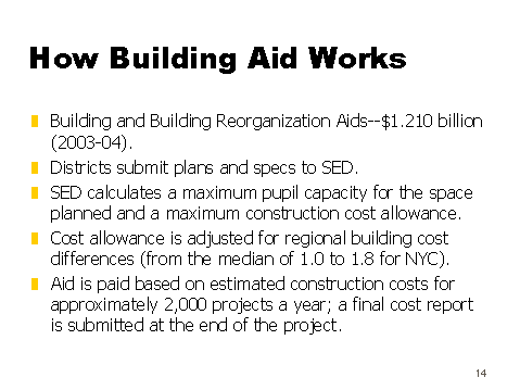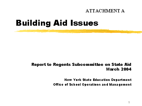 1. Building Aid issues (Attachment A). To date discussions have focused primarily on operating aid and support for the basic educational program, although many topics under consideration have implications for school facilities and State Building Aid. Attachment A presents a staff analysis of issues related to State support for school construction and school facilities, and lists recommendations advanced in your proposal on State Aid to school districts for 2004-05.